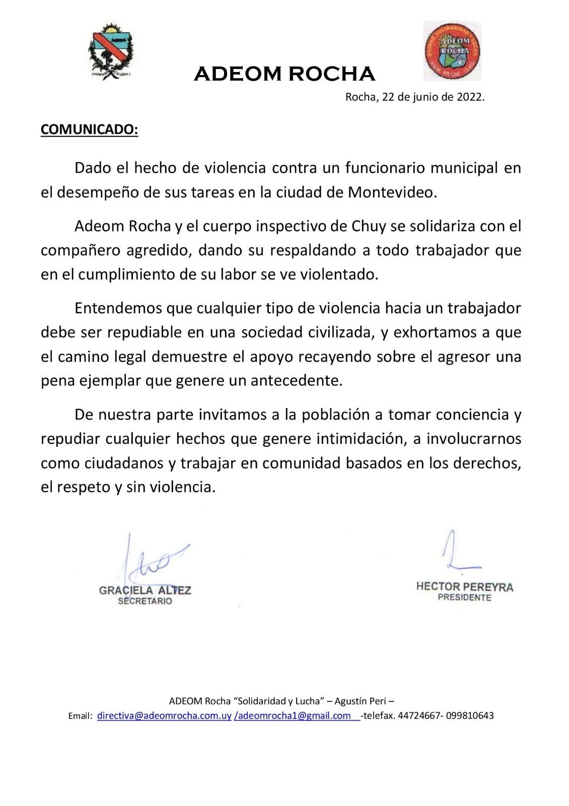 La Asociación de Empleados y Obreros Municipales de Rocha y el cuerpo de inspectores del Municipio de Chuy se solidariza con compañero agredido en Montevideo mientras cumplía con su trabajo.