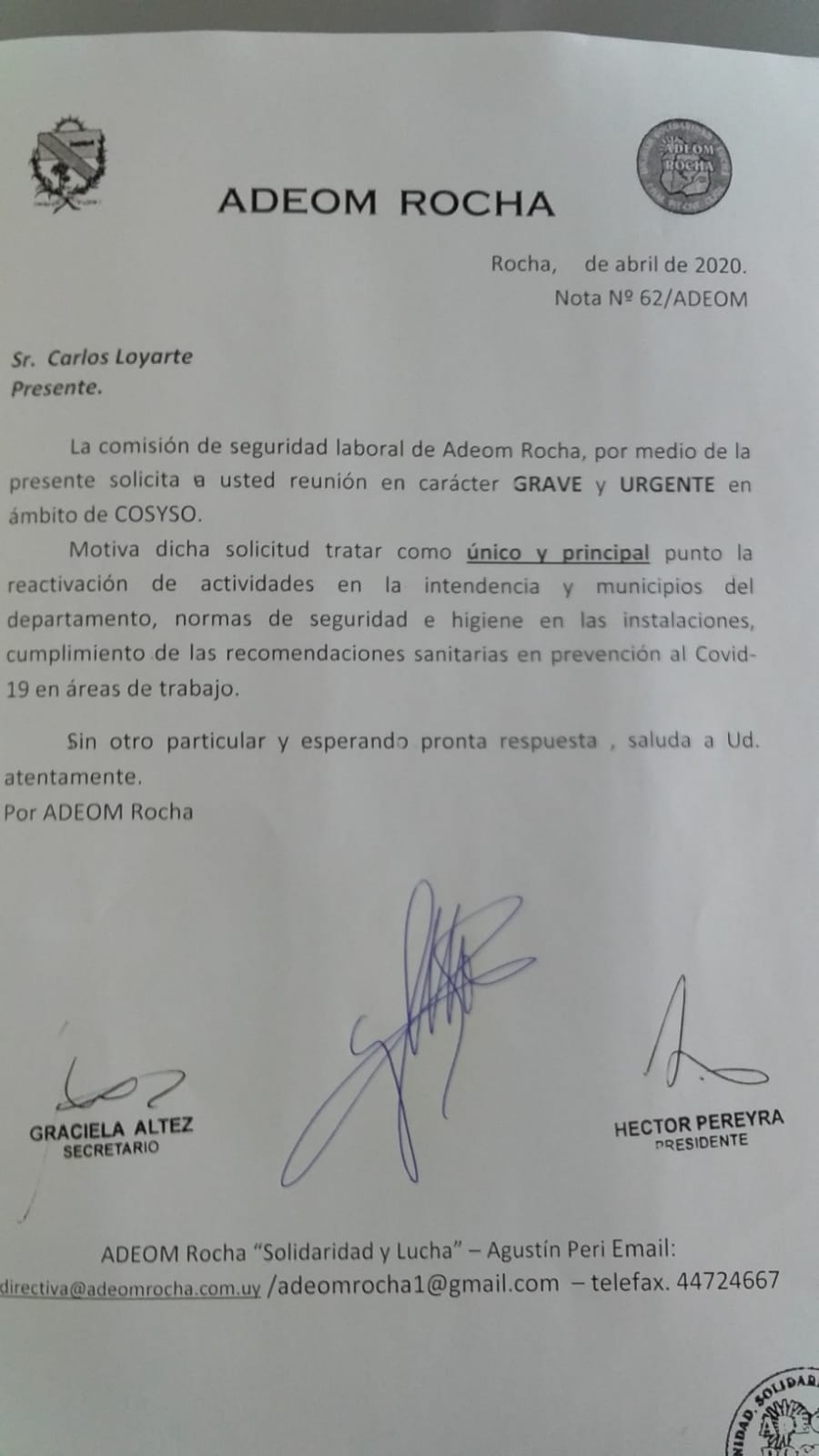 La Comision de Seguridad de AdeomRocha solicita reunion en carácter de urgente en el marco del COSYSO. El unico tema…