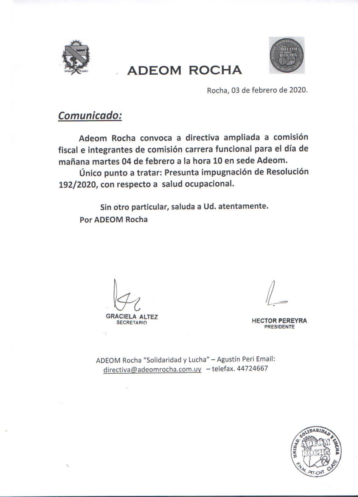 Adeom Rocha convoca a Directiva ampliada, Comisión fiscal y Comisión carrera funcional para mañana hora 10 en su sede central.