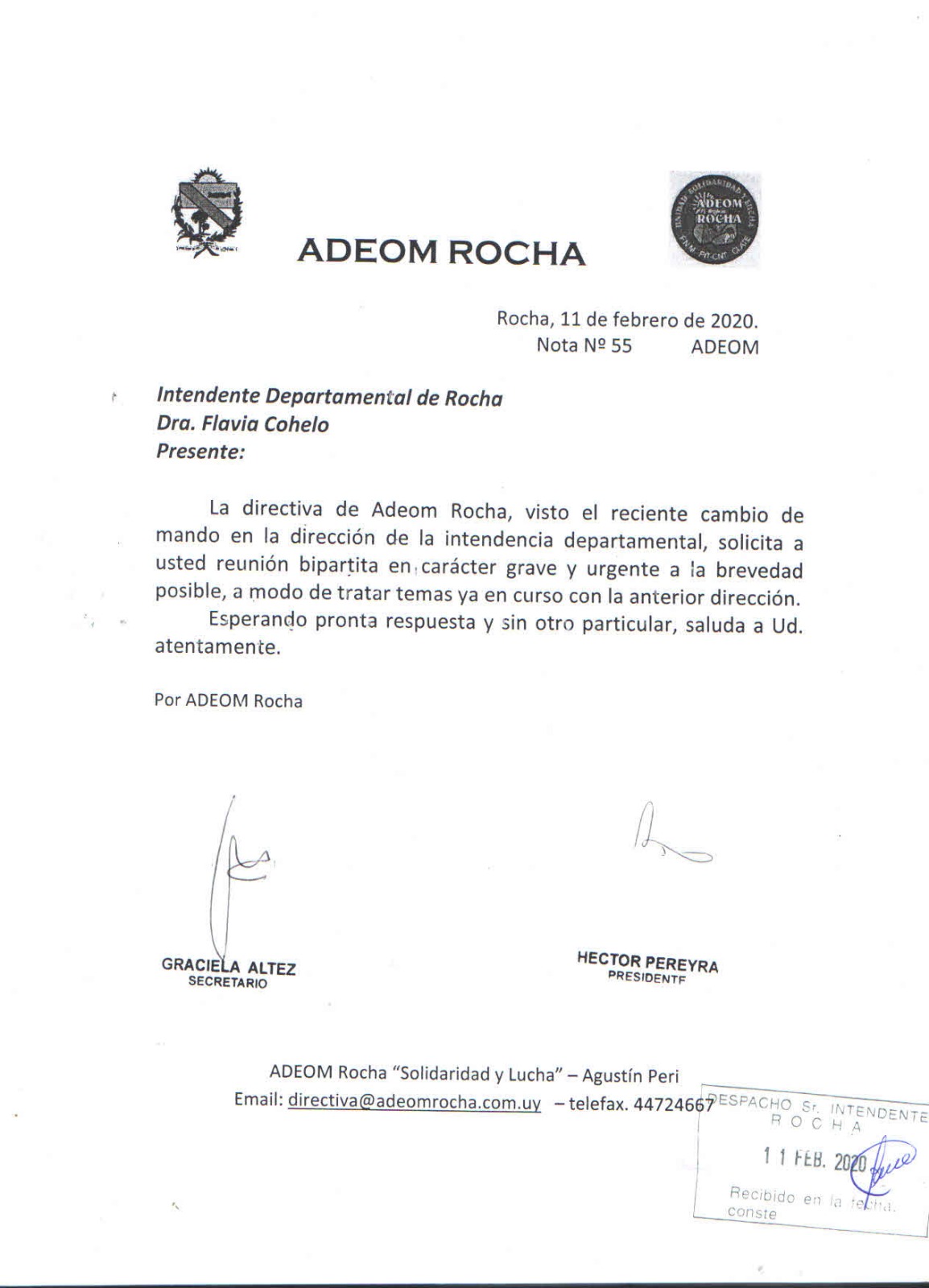 Adeom Rocha solicita reunión con la Intendente Dra. Flavia Cohelo en carácter de grave y urgente.