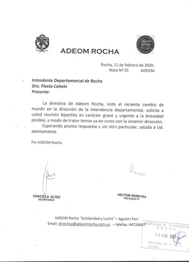 Adeom Rocha solicita reunión con la Intendente Dra. Flavia Cohelo en carácter de grave y urgente. Navegación de entradas Adeom Rocha convoca a Directiva ampliada Reunion bipartita este miercoles