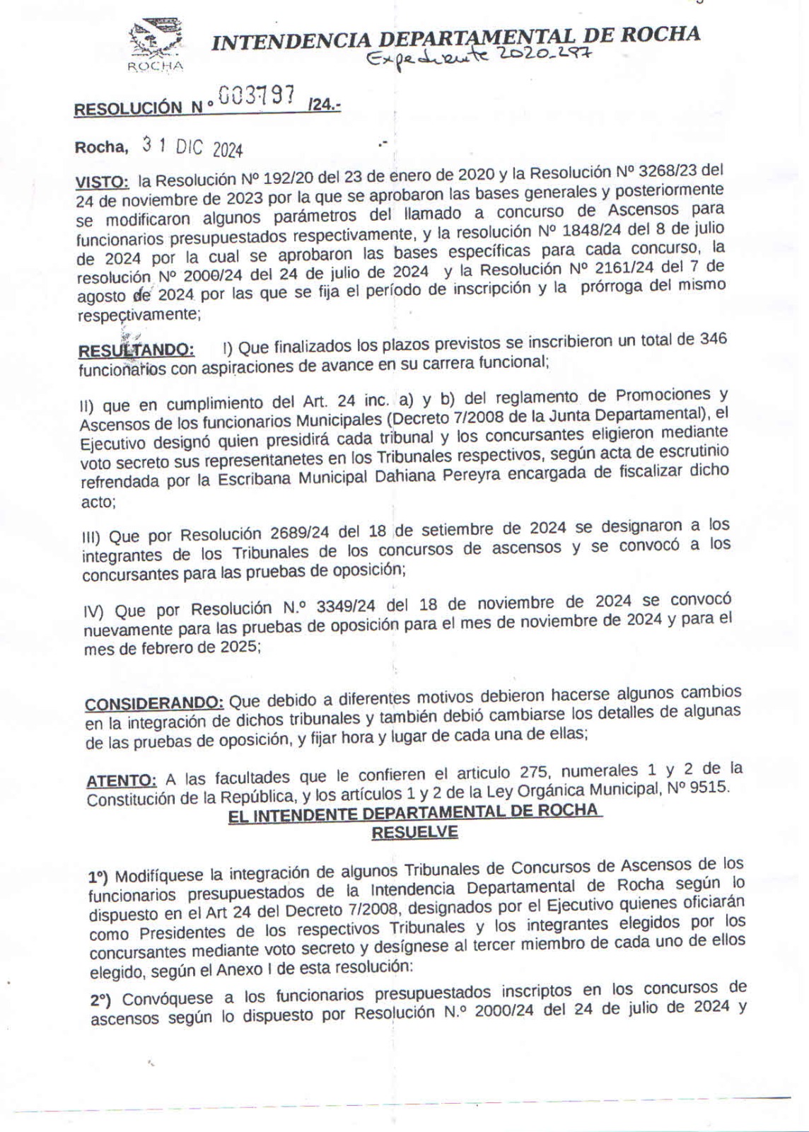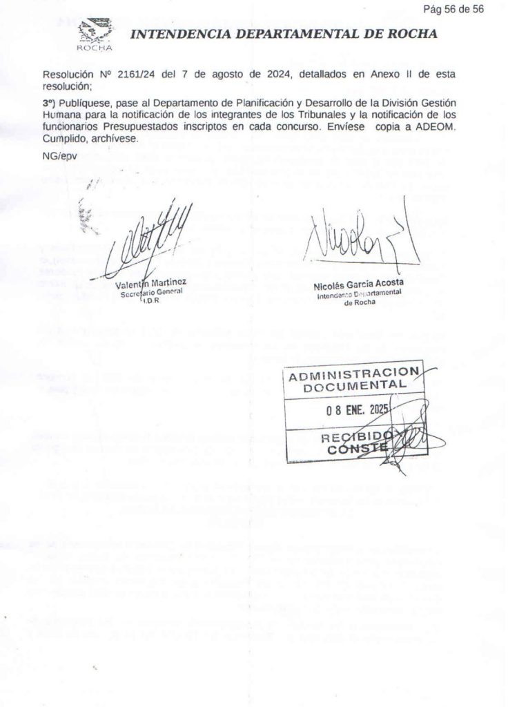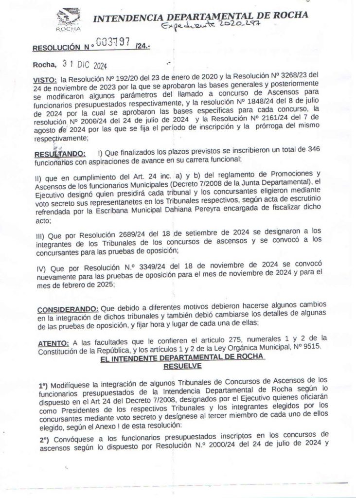 La Intendencia Departamental de Rocha, a través de la Resolución N.° 003797/24, ha anunciado importantes ajustes en el proceso de concursos de ascensos para funcionarios presupuestados. Este proceso, iniciado en 2020 y actualizado en varias instancias, ha registrado la inscripción de 346 funcionarios que buscan avanzar en sus carreras funcionales.