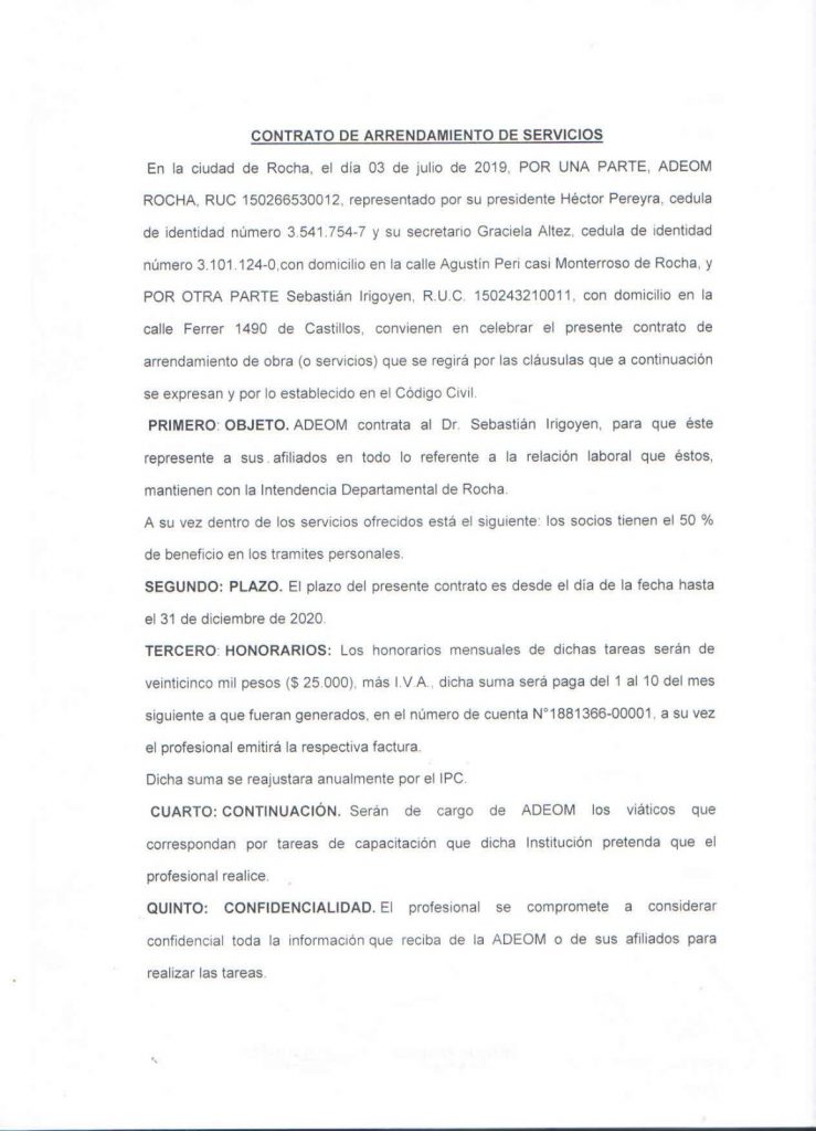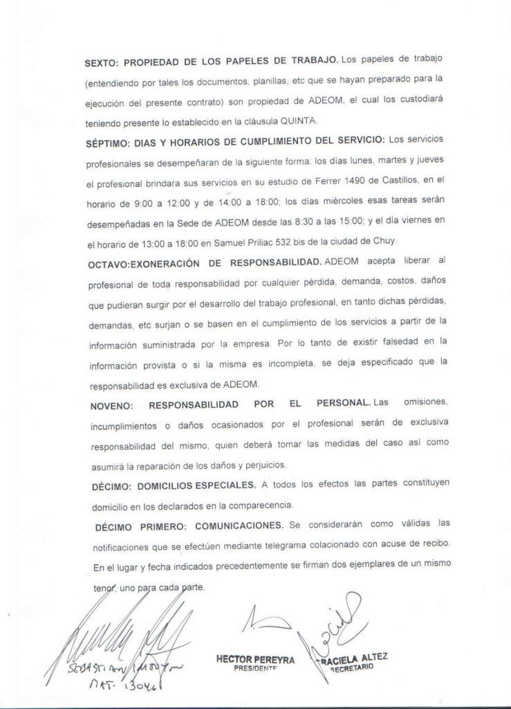 Adeom Rocha contrata asesor legal para sus socios. Por consultas en nuestra Sede Central. Presentamos el contrato firmado.