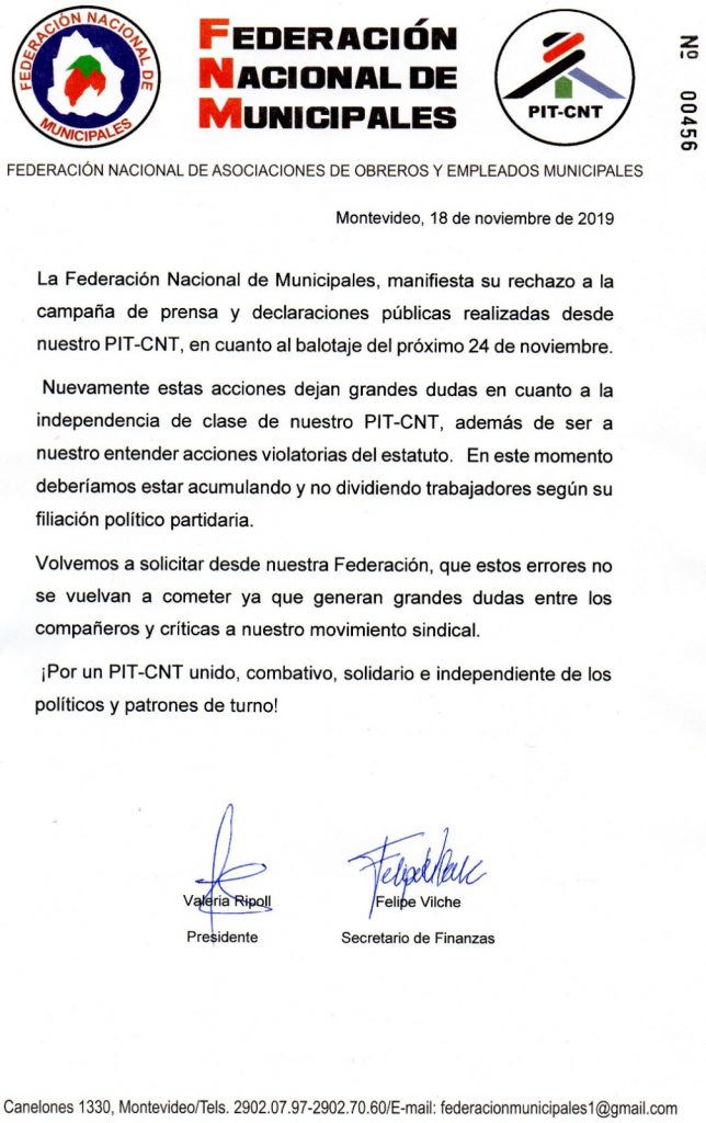 COMUNICADO DE LA FEDERACION NACIONAL DE MUNICIPALES QUE ADEOM ROCHA COMPARTE Y SUSCRIBE EN TODOS SUS TERMINOS. IMPORTANTE SU LECTURA, CON RESPETO A LA CAMPAÑA DEL PIT-CNT PARA EL PROXIMO ACTO ELECCIONARIO.